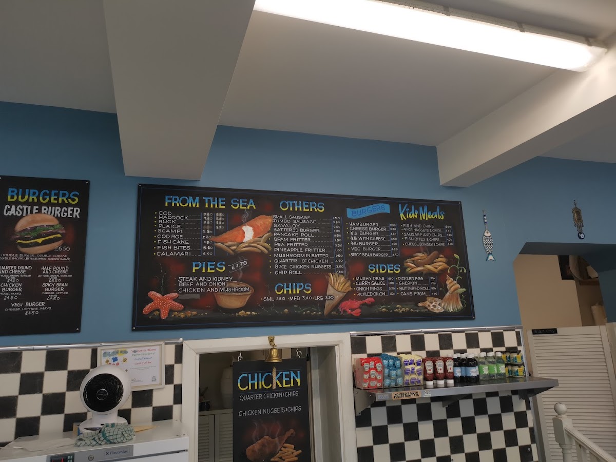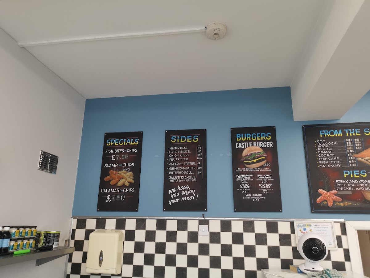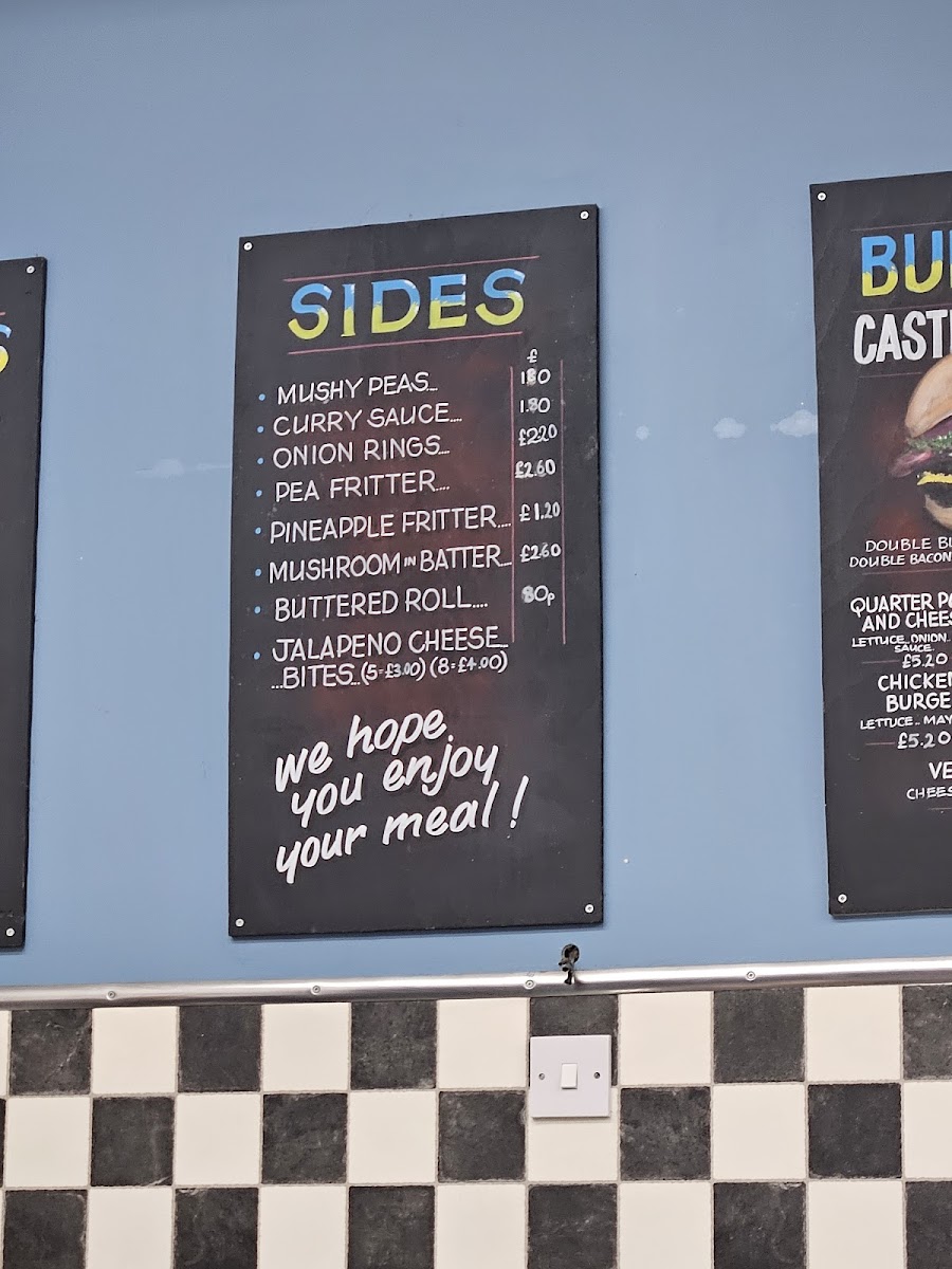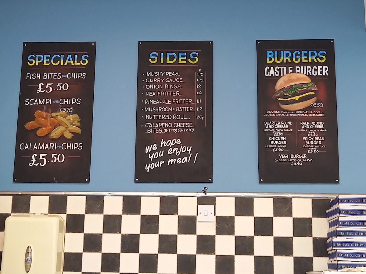The menu at Castle Fish Bar offers a delightful variety of dishes, showcasing both classic fish and chip shop options as well as some unique items. For those seeking a satisfying meal, the Scampi and Chips stands out as a special favorite, offering a generous portion of scampi paired with crispy golden chips. On the side, options such as Mushy Peas, Onion Rings, and Pineapple Fritter complement any main dish, while the Jalapeno Cheese Bites add a zesty twist for those looking to try something new. The Ish Cake and Ish Bites from the sea provide a perfect alternative to traditional fish, catering to different tastes. If you're in the mood for something less conventional, try the Battered Burger or Pancake Roll. The kids' menu features crowd-pleasers like 4-piece Nuggets & Chips and a Cheese Burger & Chips, ensuring even the little ones have a delicious option. The burger selection includes the classic Hamburger, the Cheese Burger, and even a Veg Burger for vegetarians, as well as the hearty 4lb With Cheese. For a filling, savory option, the Quarter Chicken & Chips or Chicken Nuggets & Chips are ideal choices. With a range of tasty sides and mains, Castle Fish Bar’s menu has something for everyone, ensuring a satisfying experience whether you're stopping by for a quick snack or a full meal.